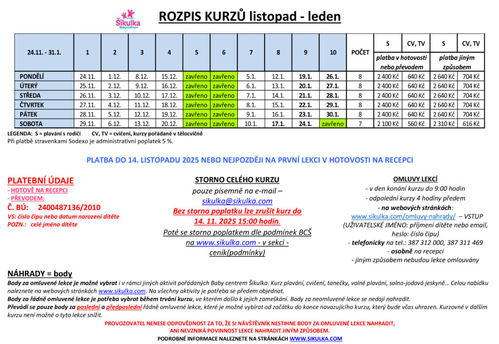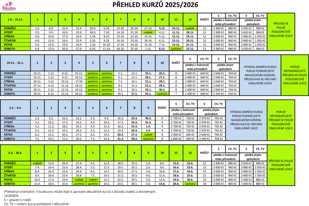Při zařazování do kurzů se snažíme dodržet vždy věkové rozpětí a pokročilost dítěte. Pokud byste ve skupince nebyli spokojeni, jsou možné v případě volných míst i přesuny v průběhu kurzu. V našem Baby centru nabízíme výhodnější podmínky např. pro rodiny s dvojčaty a pod. Rodiče také mohou využít slev od jejich zdravotních pojišťoven.